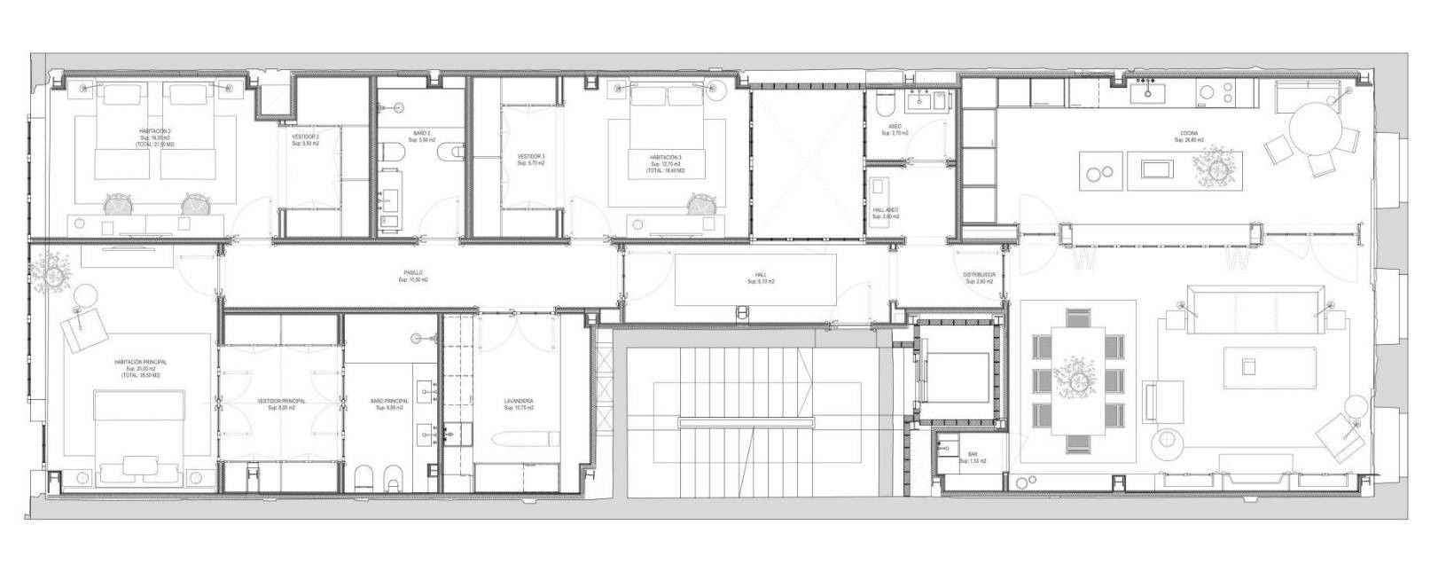 En esta ocasión se propone una rehabilitación integral, en la que se conservarán todos los elementos de valor: fachadas, escaleras, puertas interiores y estructuras de madera originales. Asimismo, se mantendrán las actuales ventanas y balcones, incorporando además un pequeño ático que completará la volumetría del inmueble.